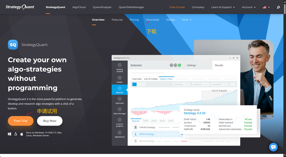 打开StrategyQuant官网 。左键单击Download,跳转到下载页面。